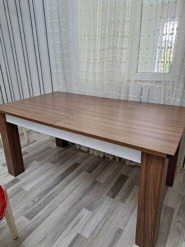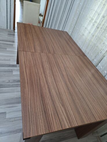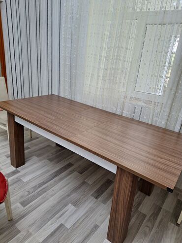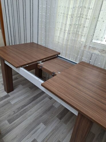 - Material: Taxta teksturalı laminat süfrə, dörd massiv kvadrat ayaq; dayanıqlı metal sürgü sistemi.