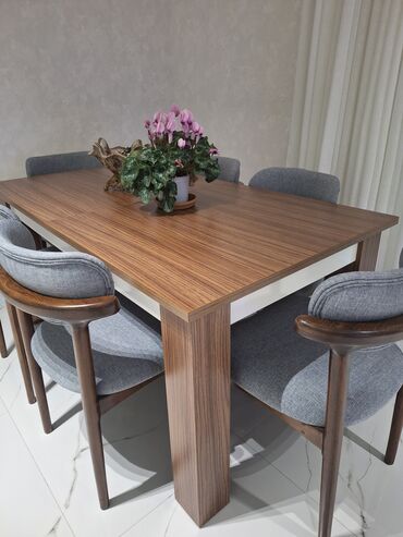 - Stullar: 6 ədəd uyğun stul. Tünd qəhvəyi taxta tonunda karkas, yumşaq boz parça oturacaq və bel hissəsi; qövs formalı qoltuqluq.