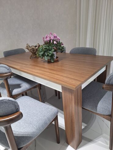 - Dizayn: Minimal və müasir üslub, qoz ağacı teksturalı süfrə və ayaqlar, süfrənin kənarında ağ dekorativ zolaq.