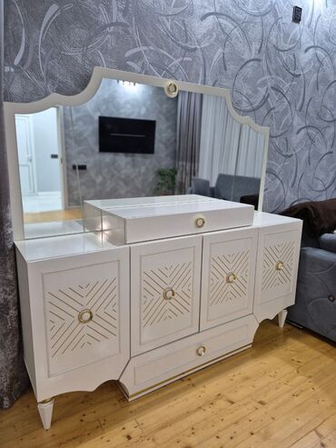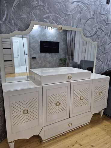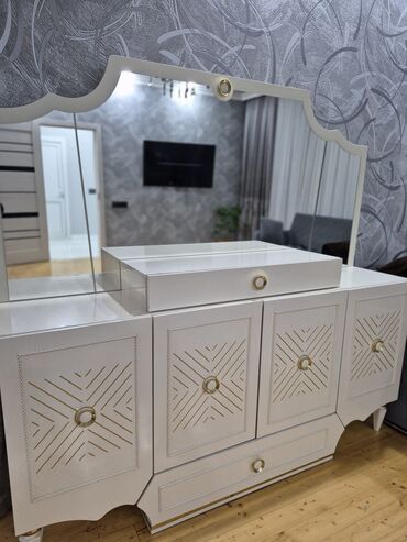 Ağ rəngli makiyaj masasə/dresser - Geniş güzgü ilə komplekt - Sağ blok: 2 böyük çekmece, ön hissədə dekorativ relyef panellər, metal düymə tutacaqlar - Sol blok: ikili qapılı dolab, içi rəfli saxl...