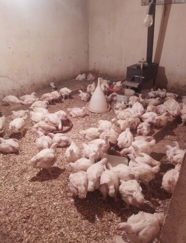 Məhsul: Broyler cücələri (ağ rəngli) Təsvir: - Şəkillərdə təsərrüfat şəraitində saxlanılan çoxsaylı ağ broyler cücələri. - Qapalı, ağardılmış divarlı toyuqxanada saxlanılır; döşəmə samanla örtülüb...