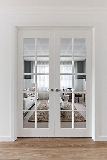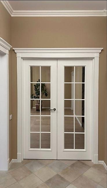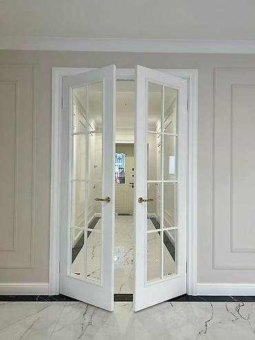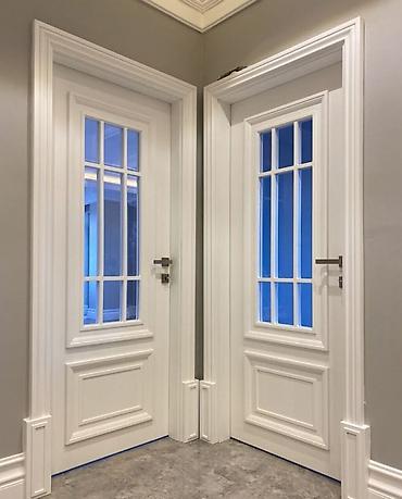 - Klassik və neoklassik üslubda dizayn: dərin profil-li plintus və pervazlar, dekorativ panellər, şüşə üçün muntin bölmələri.