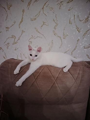 Ağ, qısa tüklü ev pişiyi - Tam ağ rəngli, parlaq tüklər - Yaş: balaca/yeniyetmə (fotolarda görünür) - Yaşıl zəngli çəhrayı boyunluqla gəlir - Sakit və mehriban görünüşlü, ev şəraitinə uyğun - Düz q...