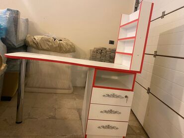 - Rəng və material: Ağ laminat səth qırmızı haşiyələrlə. Parlaq xrom dayaqlı uzun iş masası.