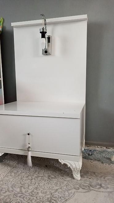 Ağ rəngli dəst: komod, güzgü və tumba - Müasir dizayn: parlaq ağ səth, üçbucaq formalı xrom tutacaqlar, konusvari ayaqlar. - Komod: 4 sürgülü çekmece; üstündə dekor və aksesuarlar üçün əlavə rəf. ...