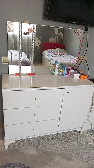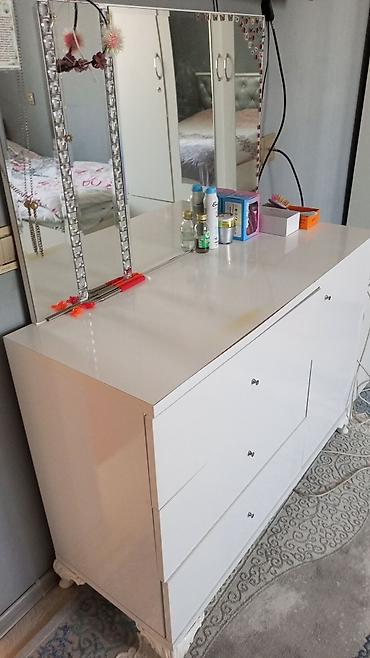 Qiymət razılaşma yolu ile 3 ədəd çarpayı, 1 şkaf, 1 makyaj masası, 2 çalışma masası Gənc otağı Ağ rəngdə funksional makiyaj/iş masası dəsti - İnteqrə olunmuş 3 bölməli güzgü: orta hissə sabit, yan...