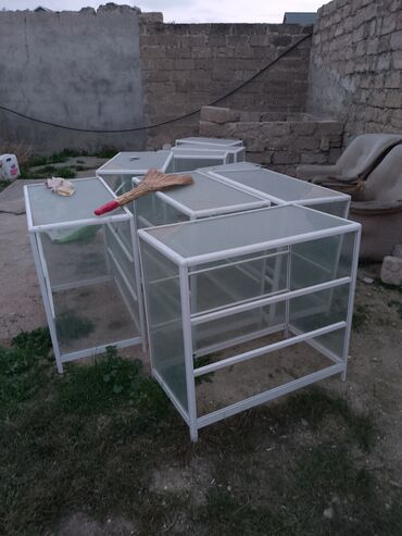- Ağ metal karkaslı, hər tərəfi şəffaf şüşə panellərlə örtülü.