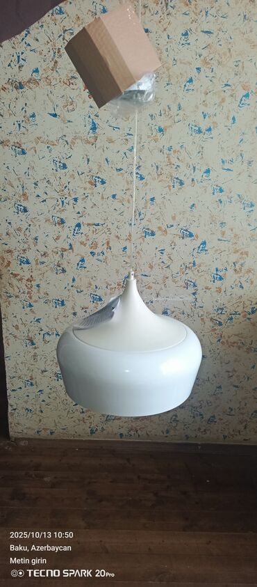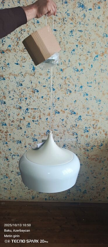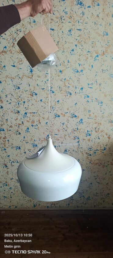 Qutuda: asma lampanın gövdəsi, şəffaf asqı kabeli, tavana bərkidilmə üçün metal baza və bərkidici aksesuarlar (şəkildə görünür).