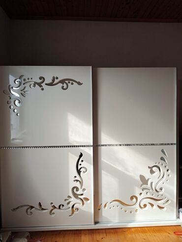 - Sürgülü qapılı qarderob: 2 geniş panel, üzərində dekorativ floral oyma naxışlar və ortadan kruştalli/metal effektli zolaq. Sürgü relsləri alt hissədədir.