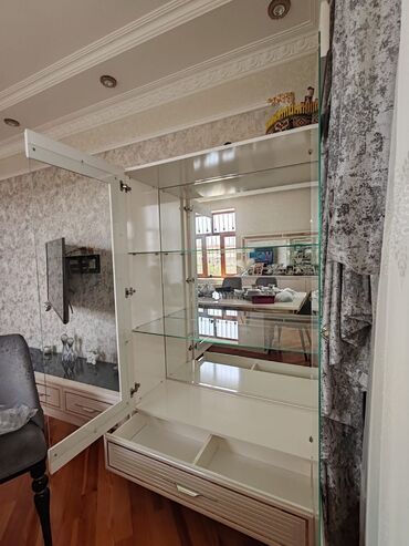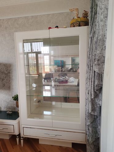 Şüşə vitrin dolabı - Dörd tərəfi şüşəli, vitrində nümayiş üçün ideal konstruksiya - Ön hissədə sürüşkən iki qapı: yerə qənaət və rahat açılıb-bağlanma - Daxildə çoxsəviyyəli şüşə rəflər: desertlər...