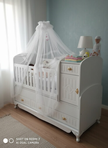 Ağ rəngli çoxfunksiyalı uşaq beşiyi və komod sistemi.