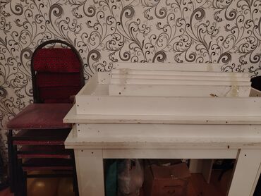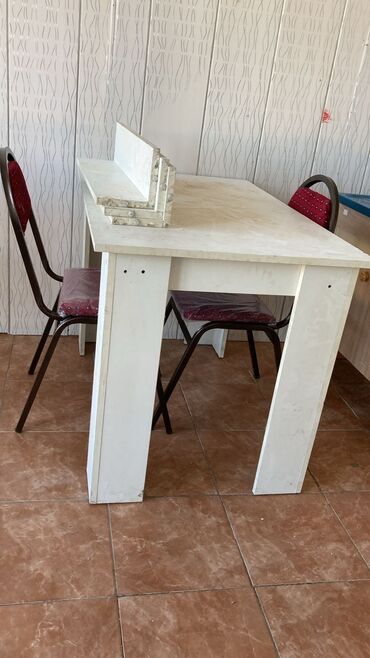 - Material: ağ rəngli MDF/LDSP tipli lövhədən hazırlanmış masa, metal karkaslı, qırmızı naxışlı üzlüklü stullarla.