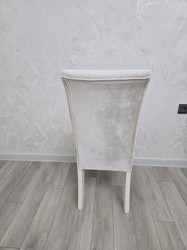 Klassik üslubda yemək otağı stulu - Rəng: krem/bej tonlarında - Material: yumşaq məxmər tipli parça üzlük, ağ ağac konstruksiya - Arxa hissə: kapitone tikişli, kristal formalı bəzək düymələri ilə ...