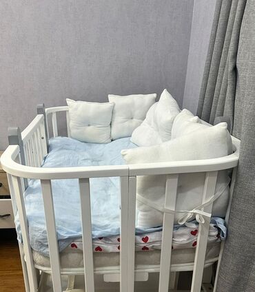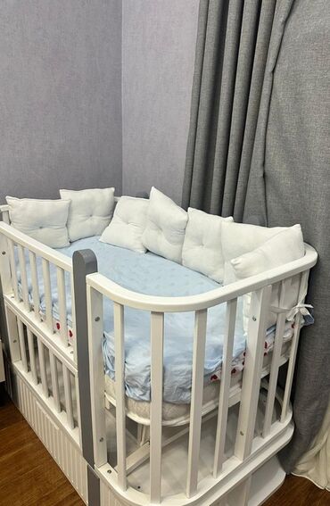 - Komplektdə yumşaq qoruyucu yastıq bortaqlar, açılıb-bağlanan iplərlə; açıq mavi örtük.