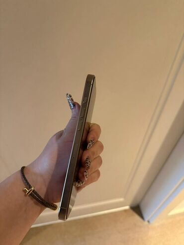 Apple iPhone (Pro seriyası, qara rəng). Arxa paneldə üçlü kamera bloku və LiDAR skanı mövcuddur. Yanlarda səs idarəetmə düymələri və səssiz rejim keçidi. Alt hissədə USB‑C portu və stereo hoparlör ...