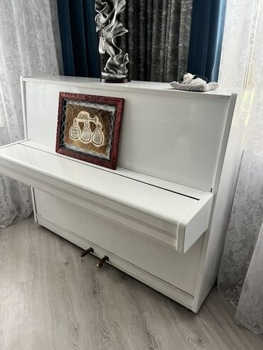 Upright pianino – ağ rəng, klassik düz korpus dizaynı.