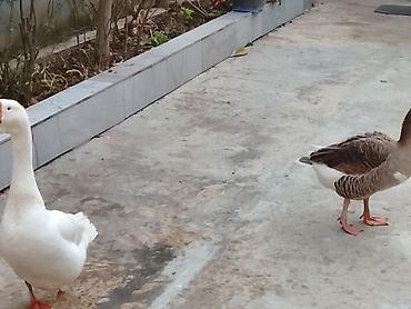 Ev quşları – qaz və ördək - Növ: Ağ qazlar (2 baş) və ağ-qara naxışlı ördək (1 baş) - Xüsusiyyətlər: - Geniş həyət və otlaq şəraitinə uyğun - Təbii yemlənməyə uyğunlaşır, güclü immunitetə mal...
