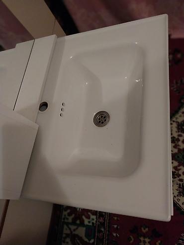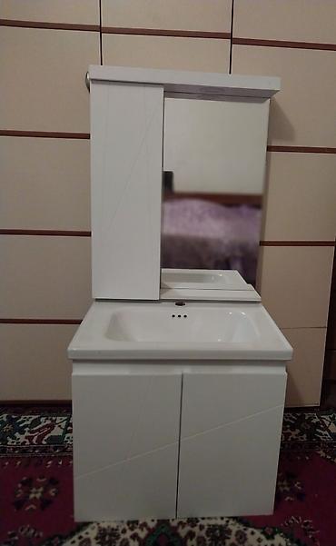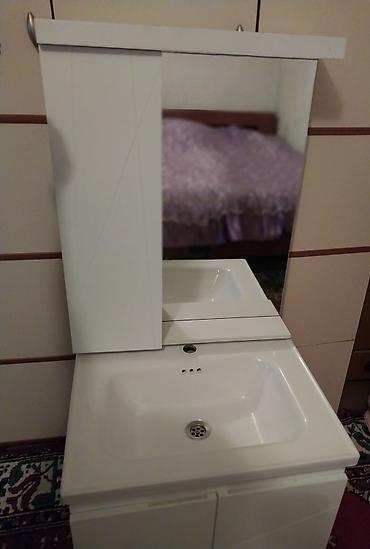 Hamam mebeli dəsti - Yuxarı hissə: güzgülü asma şkaf. Sağ tərəfdə qapılı bölmə, daxilində rəf. Üstündə işıq üçün dairəvi yer (spot) nəzərdə tutulub. - Aşağı hissə: quraşdırılmış keramik əl-üz yuya...