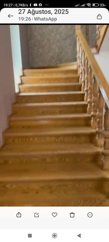 Məhsul: Taxta pilləkən dəsti - Material: Keyfiyyətli bərk ağacdan hazırlanmış pillələr və məhəccərlər - Konstruksiya: İki mərtəbəni birləşdirən U formalı (dönüşlü) layihə - Elementlər: Pillələr, a...
