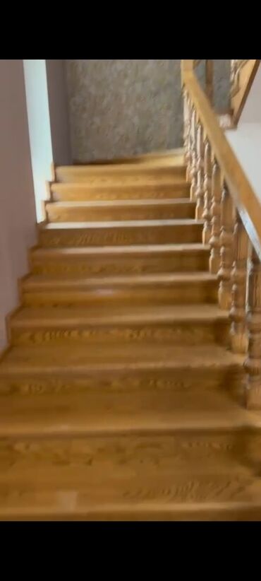 Obyekt: 2 mərtəbəli fərdi ev (daxili interyer) Xüsusiyyətlər: - Təbii ağacdan yığılıb laklanmış içpilləkən, bədii oyma korkuluklar, döngəli meydança; divarlar taxta obşivka ilə üzlənib. - Geniş qo...