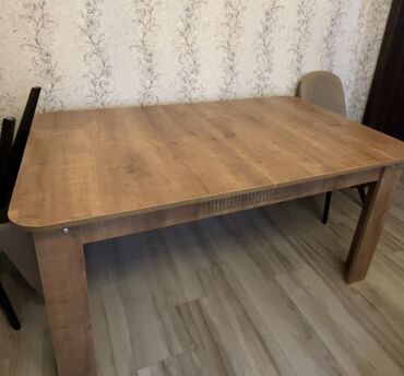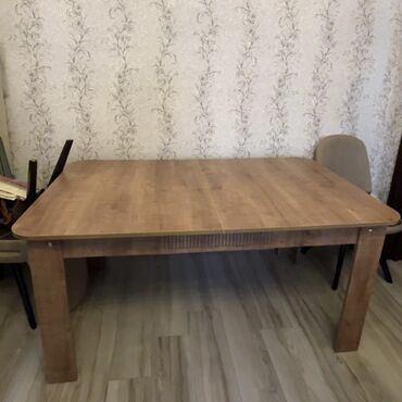 - Ölçü: iri ölçülü düzbucaqlı stol (6–8 nəfərlik oturma imkanı). Səthin ortasında birləşmə xətti var – genişlənən/qatlanan mexanizm üçün hazırlanmış üstlük