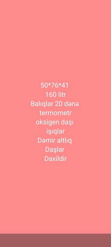 Akvarium və üst qapaq Akvarium aksessuarları ilə birgə 240 manata satılır. Əvvəl 450 manata alınıb. Təzə kimidir. Uzunluğu 77 sm, eni 30 sm, hündürlüyü 41 sm-dir. Köhnə Günəşlidədir. Jh55 zeyno♥️