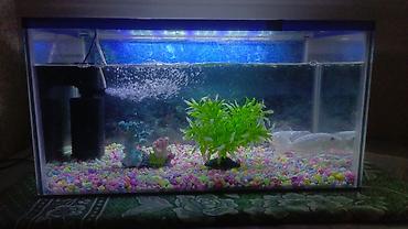 Akvarium tam dəst Üzərində akvarium, balıqlar, dekorasiya daşlari və dekorasiyalar, isıq, 2 balıq,filter və hava matoru və balıq yemi verilir
