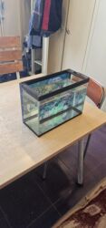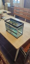 Akvarium dəsti - Şüşə akvarium, üst qapaqlı Uzunluğu 1 metr eni 50 sm - İçliklər: dekorativ daşlar (ağ çınqıl), süni bitkilər, dekorativ kötük və budaq, müxtəlif fiqurlar və qabıqlar - Arxa fonlu ...
