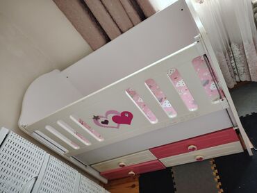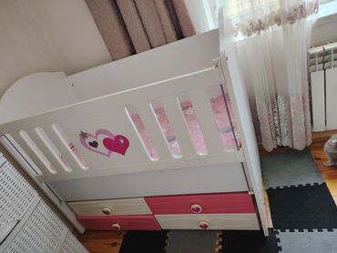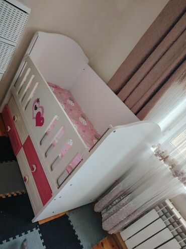 - Material: ağ rəngli laminat/MDF konstruksiya, yuvarlaq künclər, təhlükəsiz yanlıq relsləri