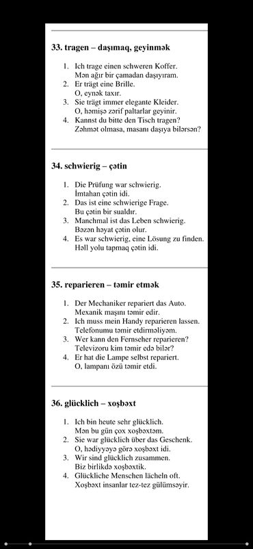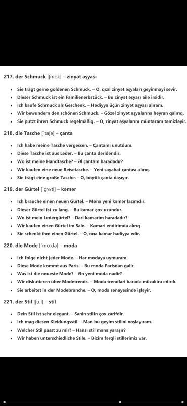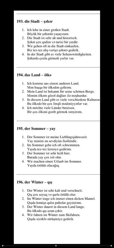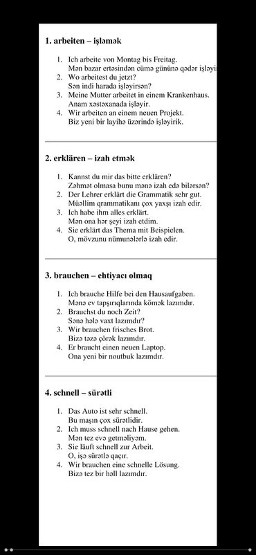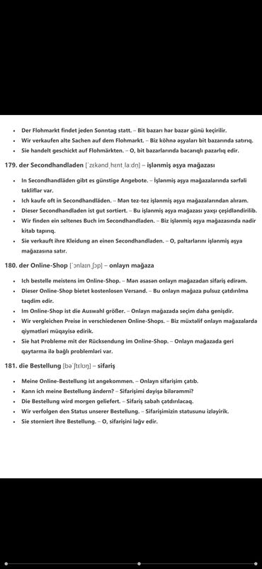 Alman dilində danışmağı öyrənmək üçün dərslik. Kitab A1 səviyyəsindən başlayaraq, gündəlik həyatda istifadə olunan 400 söz və ifadəni əhatə edir. Hər bir sözün tərcüməsi ilə birlikdə, dil öyrənmək istəyənlərə kömək edəcək cümlələr verilmişdir. Alman dilində daha sərbəst və güclü olmaq istəyənlər üçün əla vəsaitdir. Link göndərilir Telefon vəya kompüterdən google drive hesabından yükləmə edilir qiymət 2₼(karta köçürmə)
