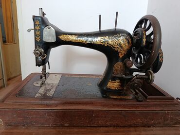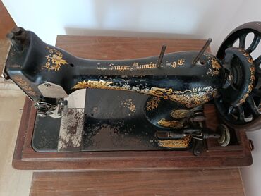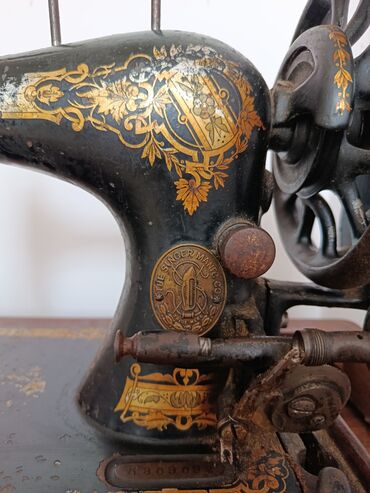 - The Singer Mfg. Co. loqolu, dekorativ qızılı naxışlarla bəzədilmiş klassik mexaniki tikiş maşını.