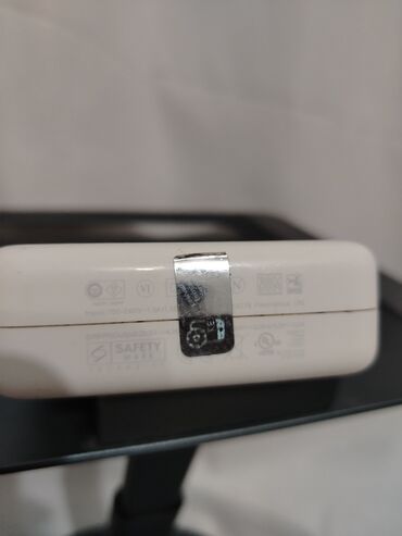 - Üstündə Apple loqosu, yan tərəfdə texniki məlumatlar və təhlükəsizlik sertifikatları (UL, Safety Mark və s.)
