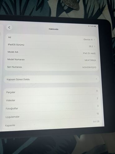 - Model: iPad (9-cu nəsil), model nömrəsi MK473RK/A