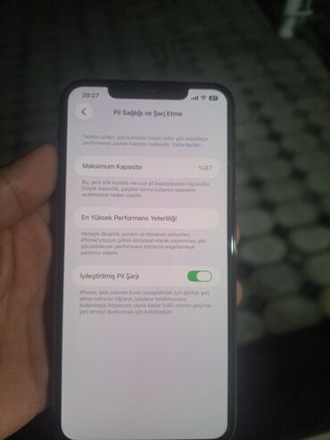 - Batareya sağlamlığı: 87% (ekranda göstərilib), Optimallaşdırılmış Şarj açıqdır