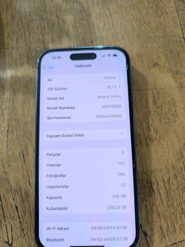 - Yaddaş: 256 GB (istifadəyə hazır təxminən 219 GB boş yer görünür)