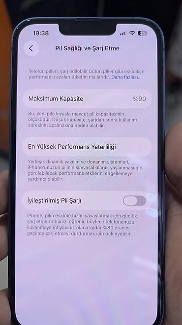 Apple iPhone (mavi rəng) - Arxa tərəf: ikiqat kamera modulu, LED flaş - Ekran: tam ekran panel, Face ID çentiği - Batareya sağlamlığı: 85% (şəkildə “Pil Sağlığı və Şarj Etmə” bölməsi göstərilib) -...