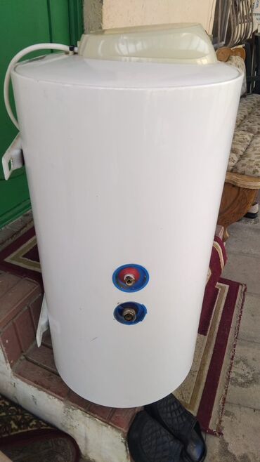 Ariston elektrik su qızdırıcısı (bojler) - Marka/model: Ariston (silindrik vertikal tip) - Tutum: təxmini 80–100 litr (şəkillərdəki ölçülərə əsasən) - Buxar/su giriş-çıxış ucları: mavi (soyuq) və ...