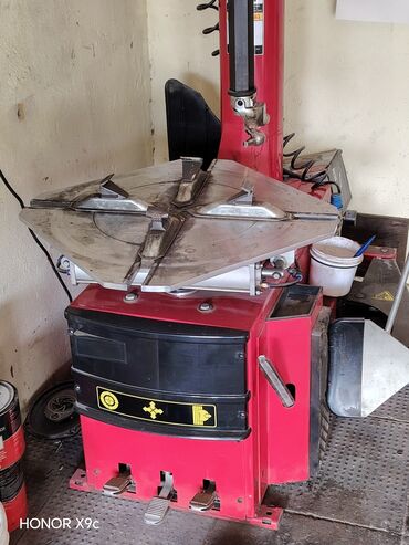 - Şin söküb-taxma stanoku: qırmızı gövdə, dörd çənəli sıxma masası, yan köməkçi qol, üç pedallı idarəetmə (sıxma/dönmə/şin ayağı), bead-breaker bıçağı və yan silindr. Minik avtomobillərinin təkərləri üçün uyğundur.