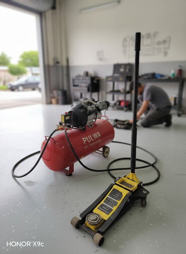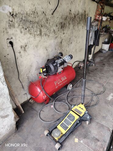 - Hava kompressoru: PULWA Air Compressor, elektriklə işləyir, qırmızı 24/50–100L sinifinə uyğun horizontal balon, təkərli şassi, təzyiq manometri və təhlükəsizlik klapanlı. Şlanqlar və qoşulma üçün çıxışlar görünür.