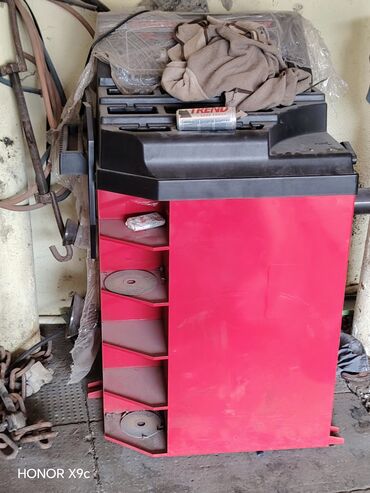 - Disk balanslama aparatı: qırmızı korpuslu, yan rəfli/çəki üçün bölmələri olan, üst hissədə ekran və alət yuvaları. Şin və disk balansının dəqiq ölçümü üçün nəzərdə tutulub.