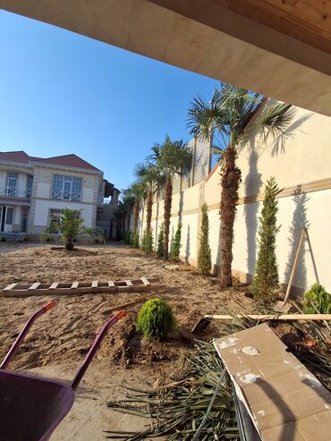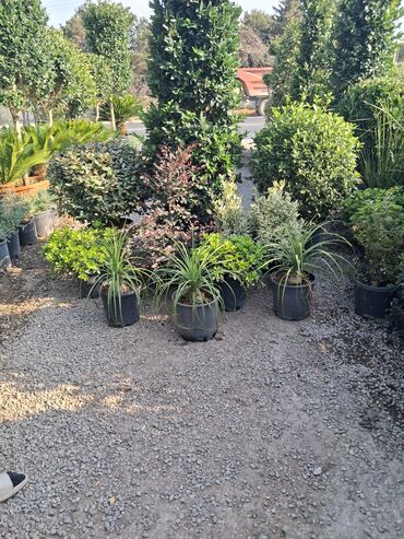 - Xurma/palma növləri: Ventilyator formalı yarpaqlı, qara plastik qablarda yetişdirilmiş, günəşə davamlı dekorativ palmalar. Həyətyanı sahələr, girişlər və terraslar üçün ekzotik görünüş verir.