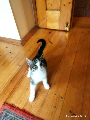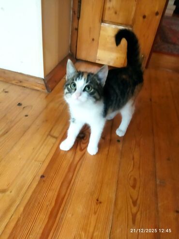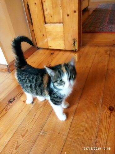- Şirin, yumşaq tüklü, qara-ağ-qonur qarışıqlı (tabby və calico naxışlı) balaca pişik
