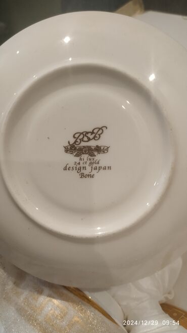 Dizayn və keyfiyyət etiketləri fincanaltının altında: “B&B hi lux, 24 ct gold, design japan, Bone”.