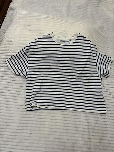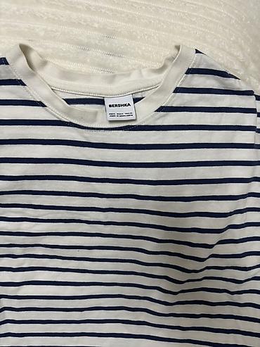 Zolaqlı qısaqol köynək Bershka - Model: Oversize kəsimli, enli qollarla rahat gündəlik t‑shirt - Naqış: Üfüqi nazik zolaqlar (qara/tünd göy və ağ tonlarda) - Yaxa: Dəyirmi, açıq krem-ağ rəngli rib...