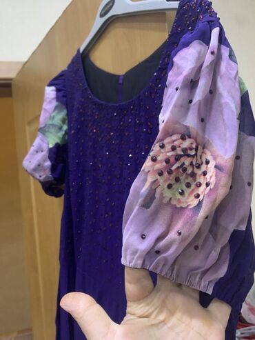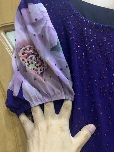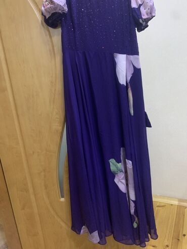 Məhsul: Bənövşəyi rəngdə ziyafət/şənlik donu - Brend: ASM (etiketdə) - Stil: İkiqat qatlı, asimmetrik kəsimli üst qat - Material: Axıcı şifon görünüşlü parça, yüngül və havalı - Rəng: Tünd bənövşə...