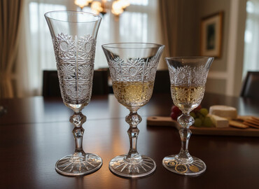 Dəstdəki hər qədəhdə eyni oyma motivi, ahəngdar görünüş. 24% qurğuşunlu kristalın klassik Bohemiya parlaqlığı.