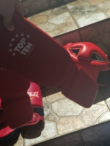 • Everlast boks əlcəkləri – qırmızı, bilək hissəsində bərkidici qayış, iç tərəfi ağ havalandırma dəlikləri ilə.