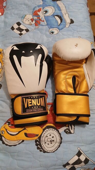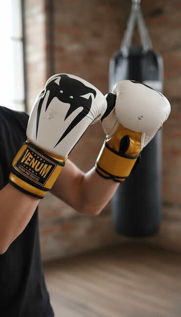 - Venum Pro Boxing boks əlcəkləri – qara‑ağ‑qızılı rəng, geniş yapışqan bağlama, qalın yumşaq doldurma, biləyi möhkəm saxlayan uzun manjet, nəfəsalma üçün perforasiya. Üzərində Venum loqosu.