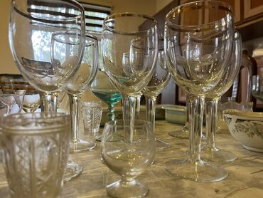 Şüşə qablar dəsti - Şüşə qədəh və stəkanlar: - 6 ədəd yaşıl naxışlı şərab/qonaqlıq qədəhi (əl boyaması çiçək motivləri, qızılı haşiyə). - 8 ədəd yaşıl şüşədən hündür su/şirə stəkanı (ağ zolaq...
