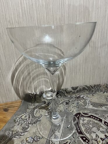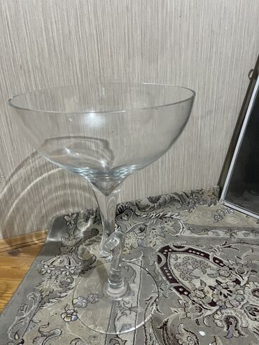 Şüşə desert/şampan kupeyanı (coupe) - Material: şəffaf şüşə - Forma: geniş ağızlı, dayaz kasa tipli coupe; dəyirmi ayaqlıq və qalın, damla formalı gövdə - Bəzək: kasanın iç və dış səthində mat nax...